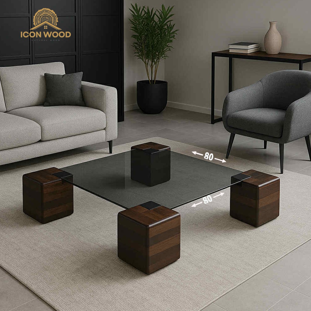 طاولة وسط بتصميم من الخشب الطبيعي مع زجاج.
